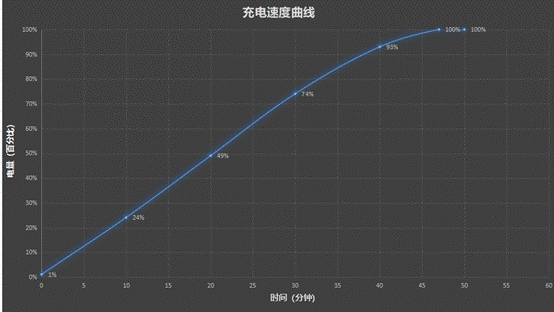 可以看到,充电10分钟达到24%,20分钟达到49,半小时达到74%,最终完全充满用时47分钟。