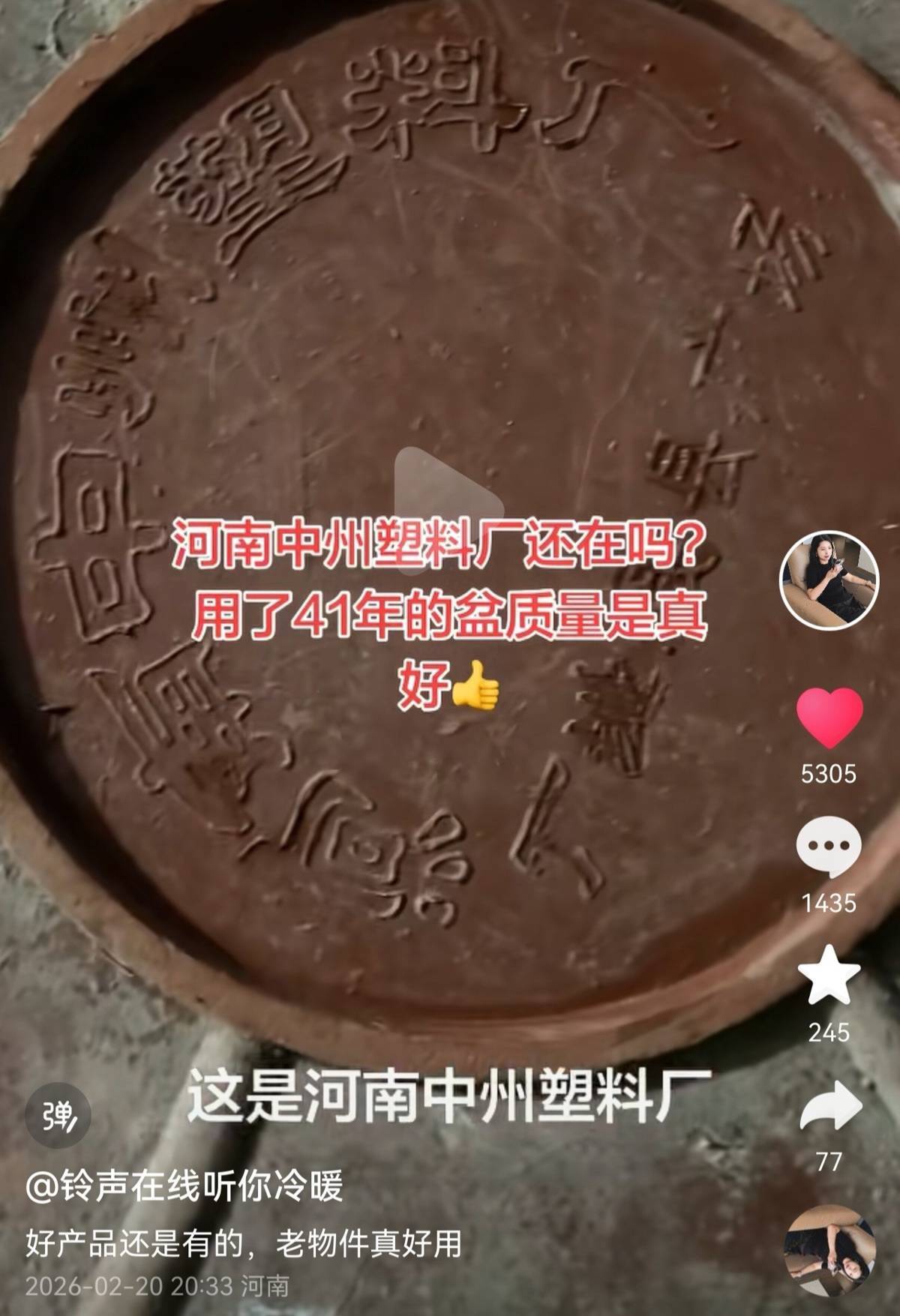 2月20日晚,网友@铃声在线听你冷暖 发视频称,她家有个塑料盆是1984年买的,质量真的好,用到现在了都没烂,也不知道厂家还在不在,想再买几个。