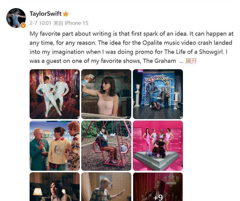 近日,霉霉在社交平台上罕见更新了一条动态,文中大致是在分享她创作《Opalite》 MV时的一些灵感来源。