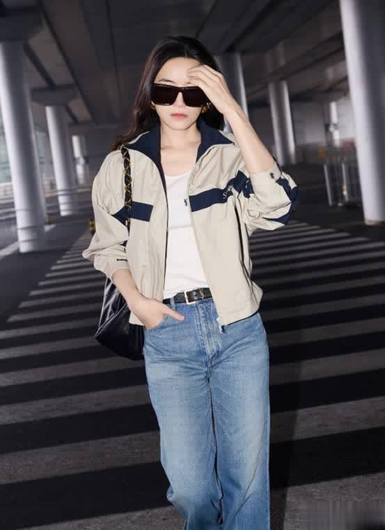 出发造型一身卡其色夹克、蓝色牛仔裤,戴着墨镜单手插兜,走起路来脚下带风。