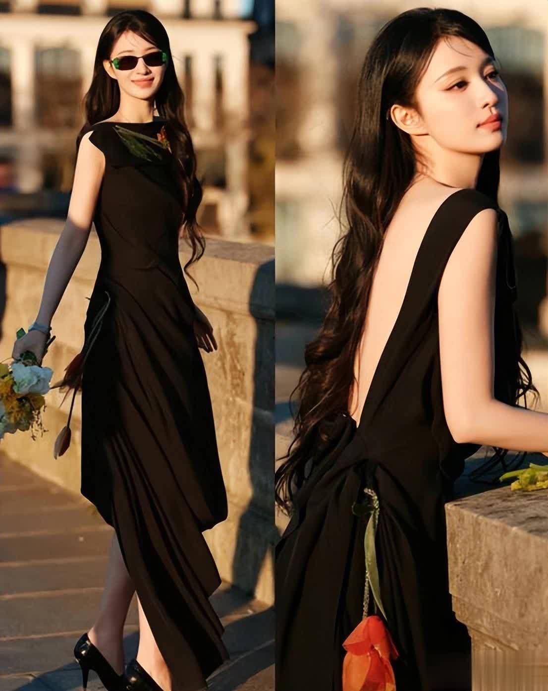 黑色长裙不规则的领口、裙摆颇有设计感,轻盈灵动,纱质面料堆叠出的立体花朵点缀在领口,整体看起来并不沉闷。