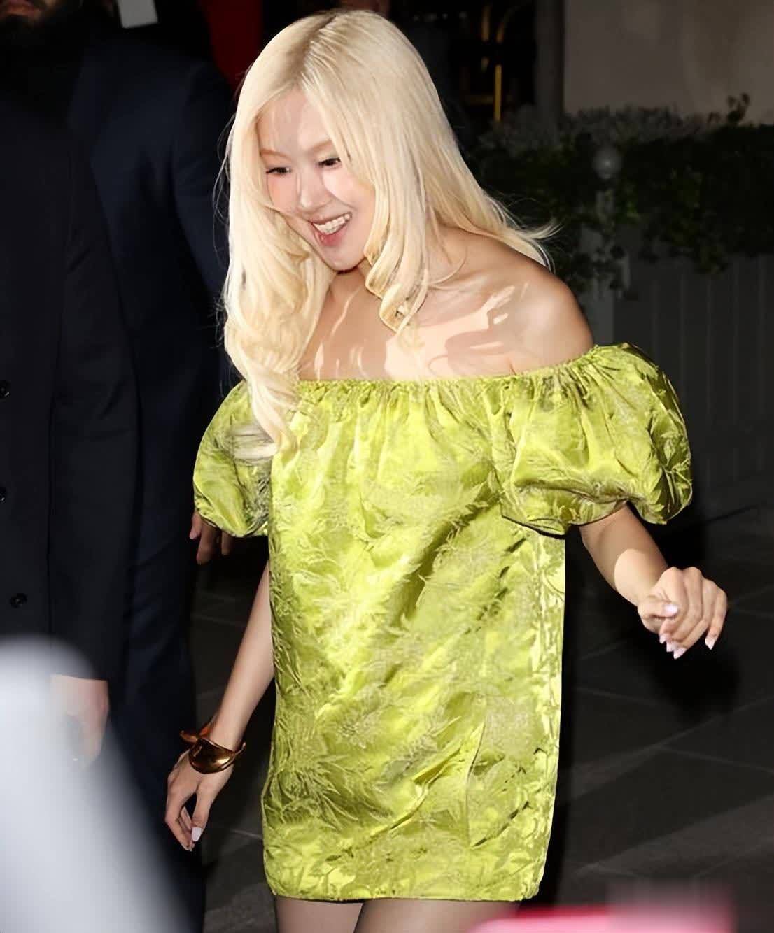 翠绿色提花短裙比较符合她一贯冷艳的风格,但是这条裙子的版型不怎么适合她,既不能凸显身材比例,泡泡袖的设计还显得有些臃肿。