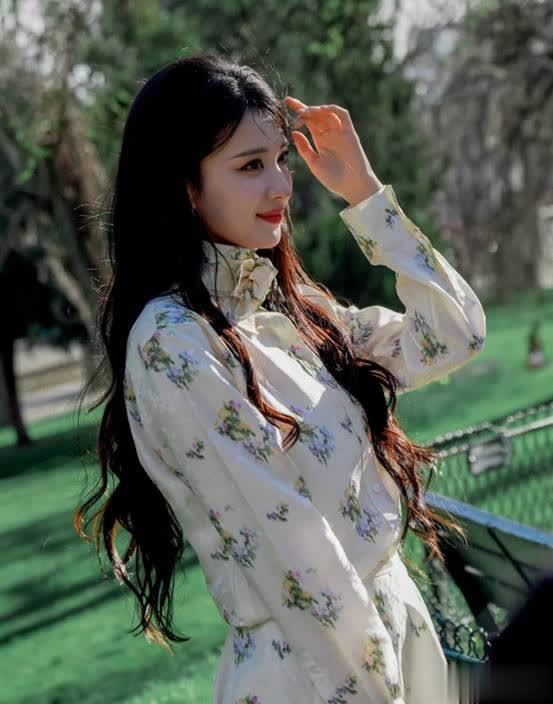 她在参加活动时一身米白色碎花短裙丝毫不土气,反而带着浓郁的春日氛围浓郁。