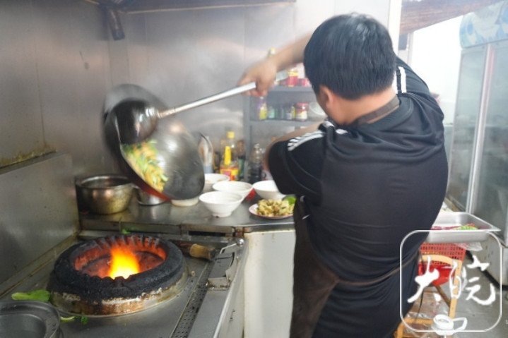 “我三四岁就开始到店里给父母帮忙了,6岁的时候学炒饭,现在已经会烧20多道菜。”刘宇泽一边说着,一边在面板上切着菜。8月16日,记者见到刘宇泽时,他正准备给顾客烧菜。说话间,他给灶台生火,将洗刷干净的炒锅放好,锅热后倒油、倒菜、翻锅、颠锅、抛锅、颠勺、出菜……一套行云流水般的操作过后,一份豆饼青菜出锅了。这样的素菜,刘宇泽两三分钟就可以炒好一份。