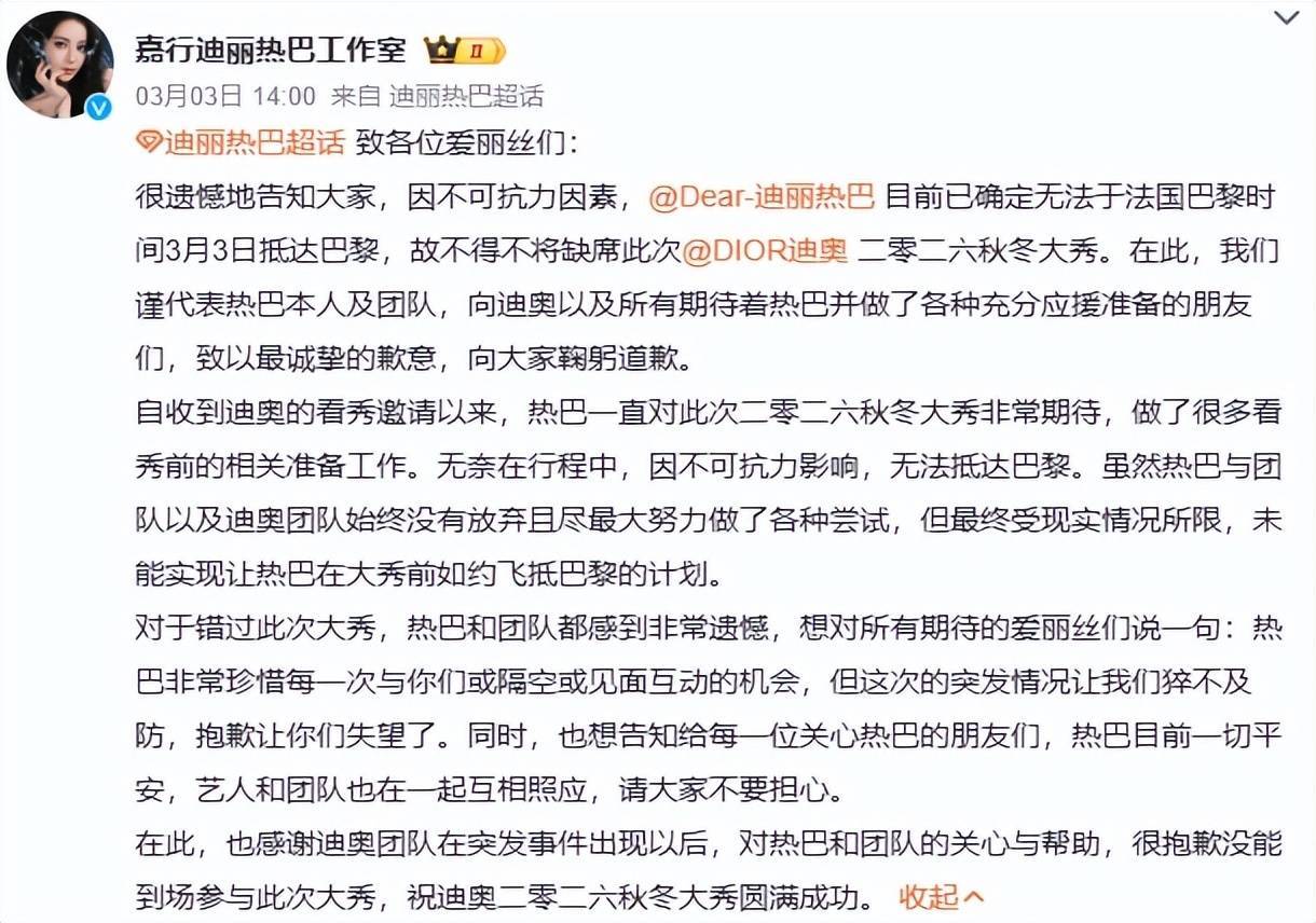 结语值得一提的是,原本迪丽热巴也计划参加此次的巴黎时装周,并原定于2月27日搭乘阿联酋航班转机巴黎,没想到28日阿联酋航空全面停飞,导致迪丽热巴滞留迪拜超过24小时,让人不免担心起她的安危。