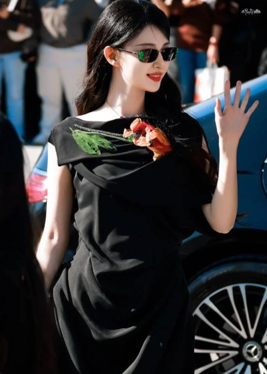 说实话,其实王楚然的造型并没有多亮眼,这一身全黑斜裁长裙,再加上衣领上的立体花卉设计,太有年龄感了,但奈何楚然实在貌美,简简单单的墨镜配上大红唇,女明星的风采瞬间绽放开来,就连头发丝都仿佛散发香气。